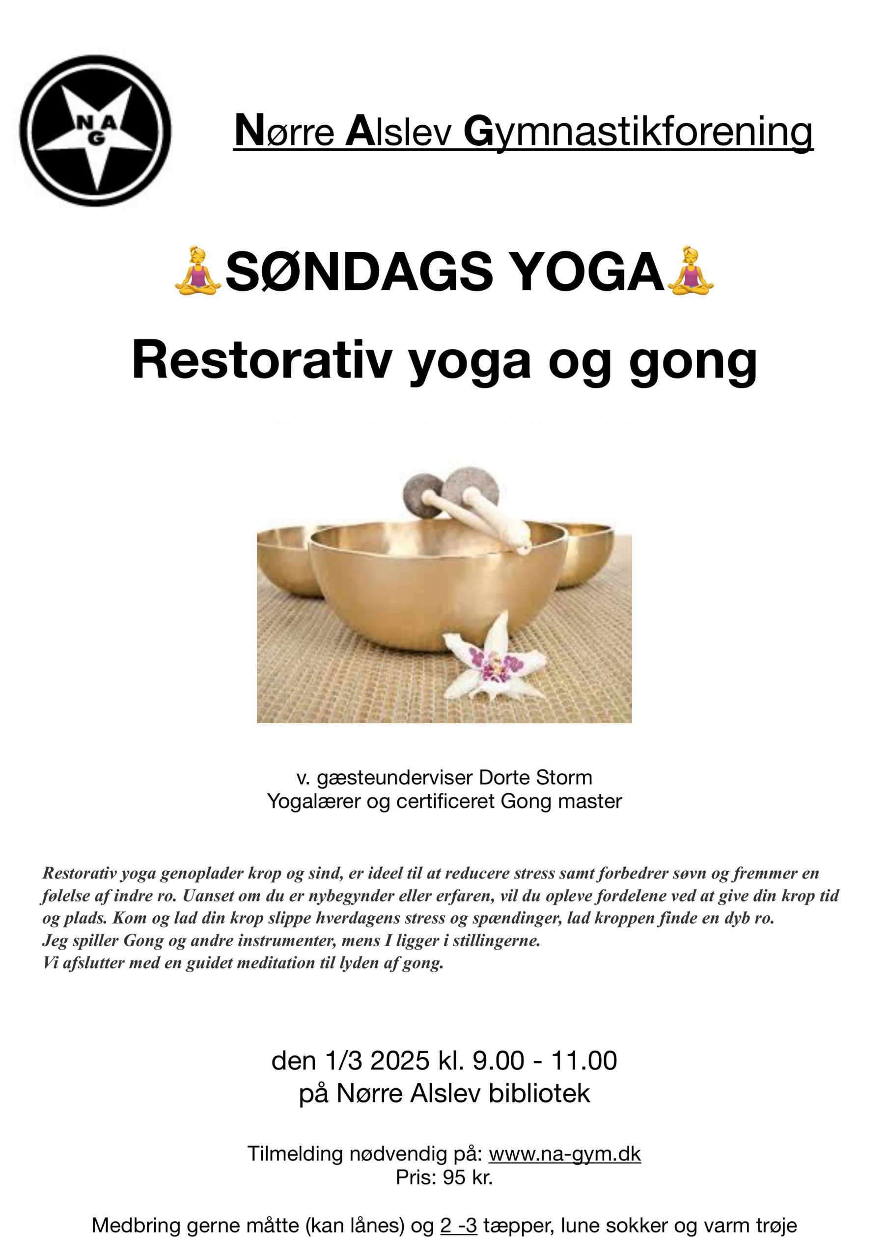 🧘 Kom og vær med, når certificeret Gong master Dorte H. Storm den 1. marts 2026 kl. 9.00-11.00, guider dig igennem stillingerne til lyden af Gong og andre instrumenter. Mærk hvordan restorativ yoga genoplader krop og sind, og lad kroppen finde en dyb ro.